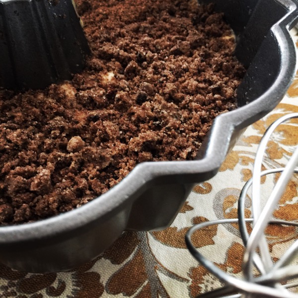 For this recipe I used my bundt pan, so I sprinkled some Cinnamon Crumbs first and then added Cake batter. Also I sprinkled the leftover Crumbs on top of batter.