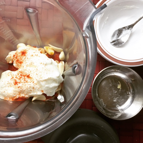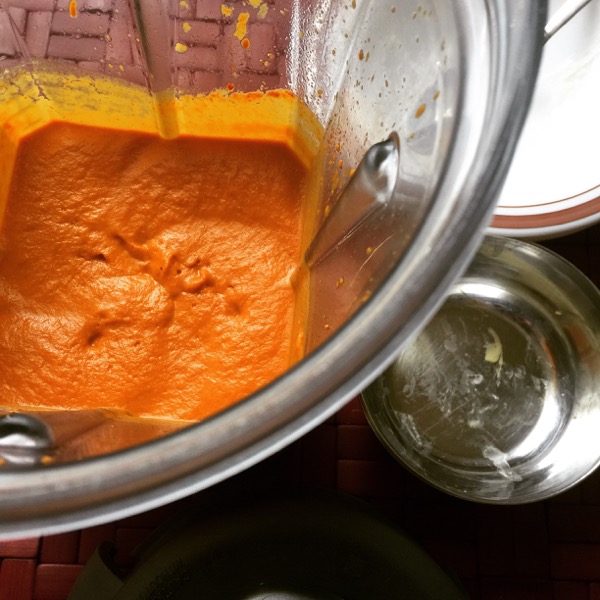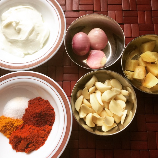 - Using a blender or grinder, make a smooth paste of Shallots, Garlic, Ginger, Cumin, Chilli, Turmeric, Paparika, Salt and Yogurt.